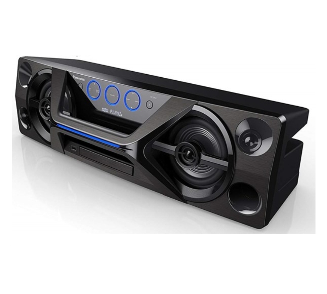 Creating a stylish space Urban-space design The central buttons are backlit and the line running along the handle is also illuminated. These blue lights break up the black surface, adding to the urban design feel. The horizontal speaker system delivers remarkably clear, powerful sound from the compact one-box design, and the horizontal shape provides stability so you can safely place the box virtually anywhere.