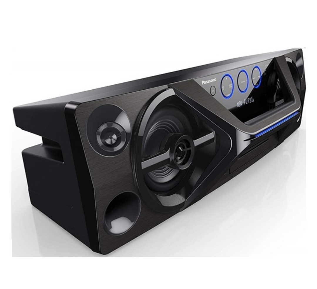 Creating a stylish space Urban-space design The central buttons are backlit and the line running along the handle is also illuminated. These blue lights break up the black surface, adding to the urban design feel. The horizontal speaker system delivers remarkably clear, powerful sound from the compact one-box design, and the horizontal shape provides stability so you can safely place the box virtually anywhere.